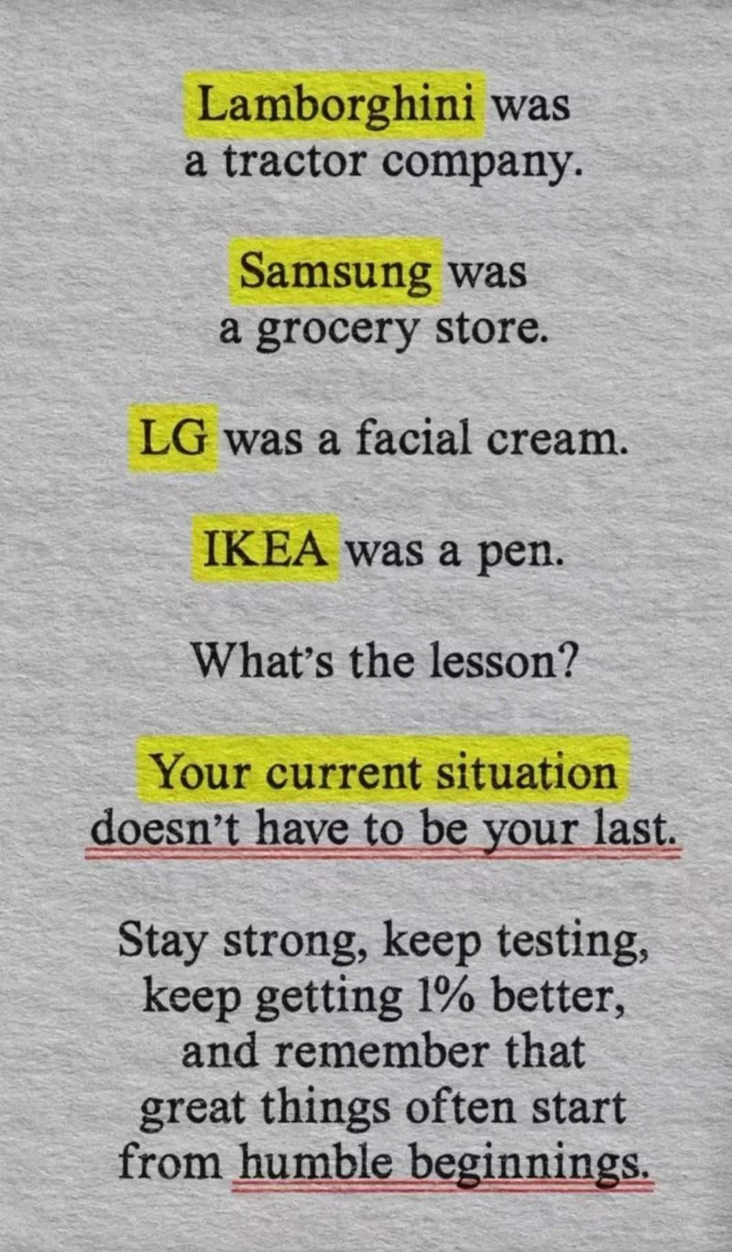 Stay strong, keep testing, keep getting 1% better, and remember that great things often start from humble beginnings.