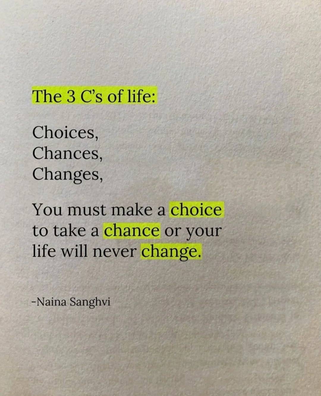 你必须主动做出选择、抓住机遇,否则人生永远不会迎来改变。 人生有三个核心 “C”:选择(Choices)、机遇(Chances)、改变(Changes)。 你必须主动做出选择、抓住机遇,否则人生永远不会迎来改变。 —— 奈娜・桑维 The 3 C’s of life: Choices, Chances, Changes, You must make a choice to take a chance or your life will never change. -Naina Sanghvi Post Views: 86 相关格言: 成为自己想成为的人,这件事没有早晚可言。 世界就是这样,自甘沉沦的无名小辈,毫无立锥之地。 美没有用,很美才有用。 渔夫出海前并不知道鱼在哪里,可是他们还是选择出发,因为他们相信,一定会满载而归。